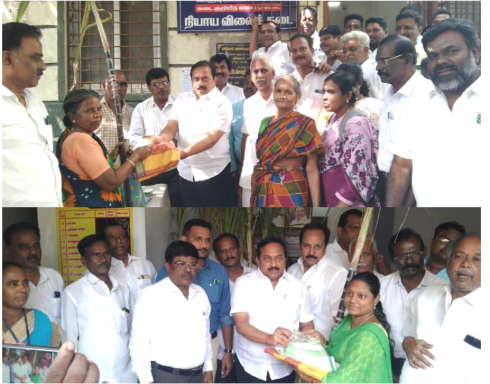 மாண்புமிகு தமிழ்நாடு முதலமைச்சர் கழகத் தலைவர் அவர்களால் பொங்கல் விழாவை முன்னிட்டு பரிசுத்தொகை ரூபாய் 1000 வேட்டி, புடவை, அரிசி,சரக்கரை,கரும்புஆகியபொருட்கள்அடங்கியபொங்கல்பரிசுத்தொகுப்பி ணை வழங்கினார்.